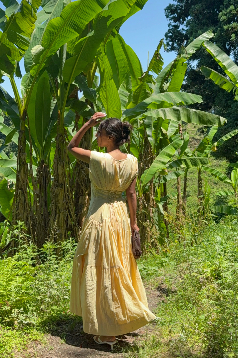 A statement in structure and softness โ€” the Banana Punch Dress brings bold femininity to life. With its corset-inspired waist, asymmetrical hemline, and gathered panelling, this midi dress is made to sculpt, flow, and shine.