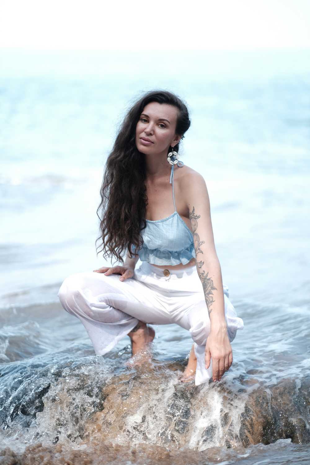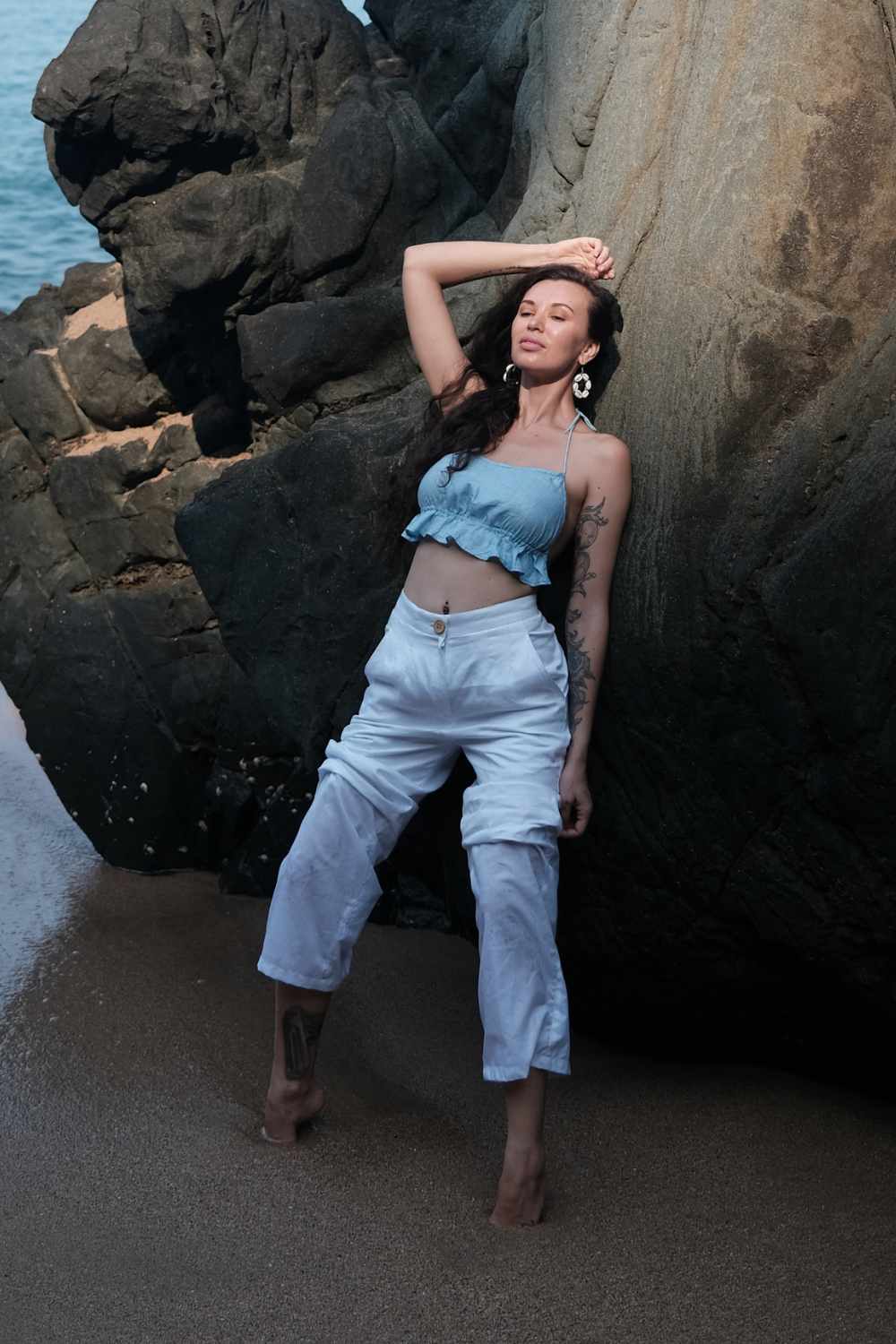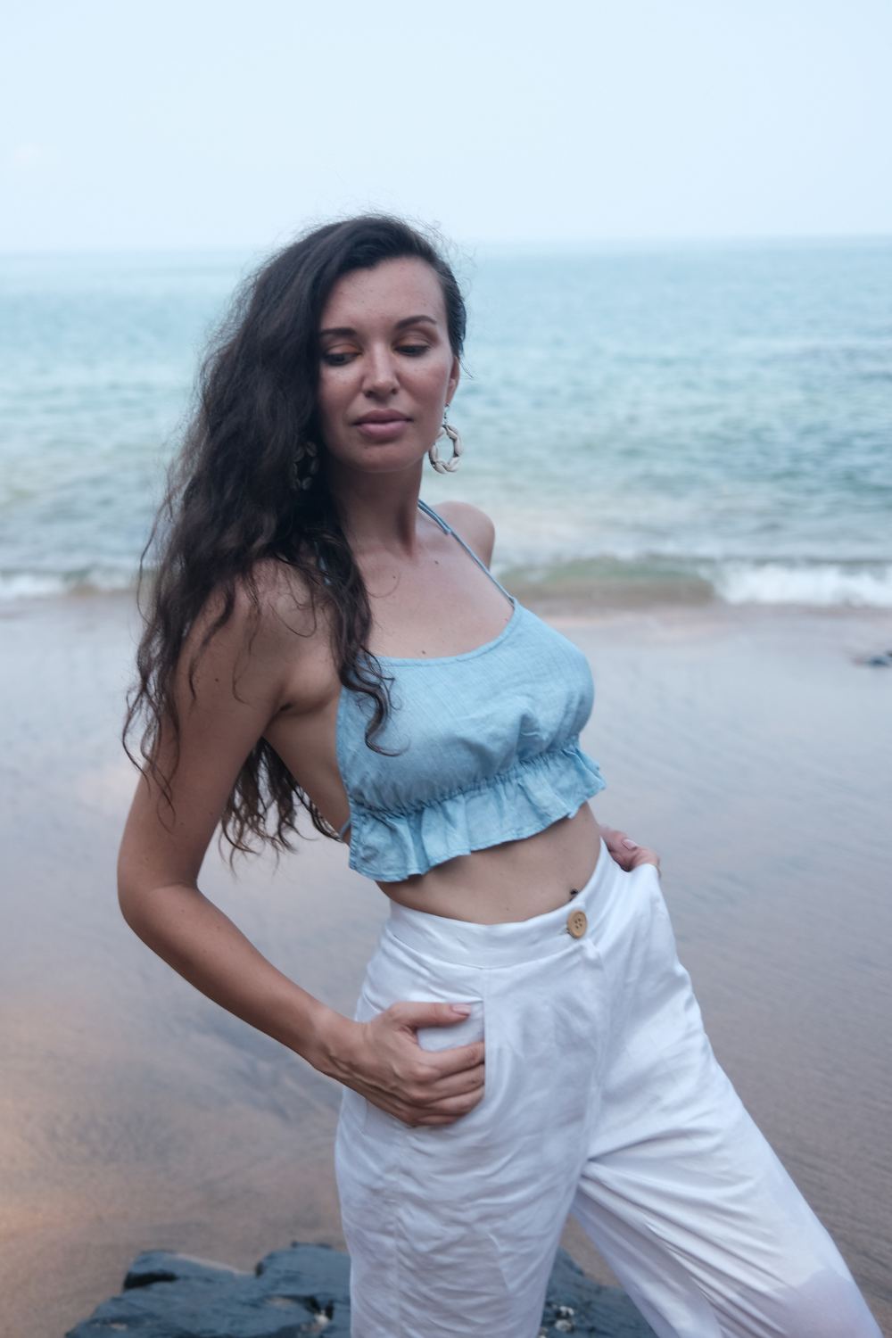 This powder blue backless crop top features a flattering halter neck, offering a cool and relaxed fit.